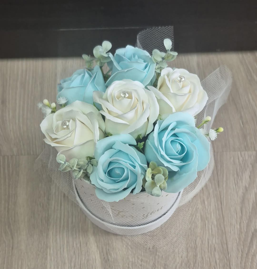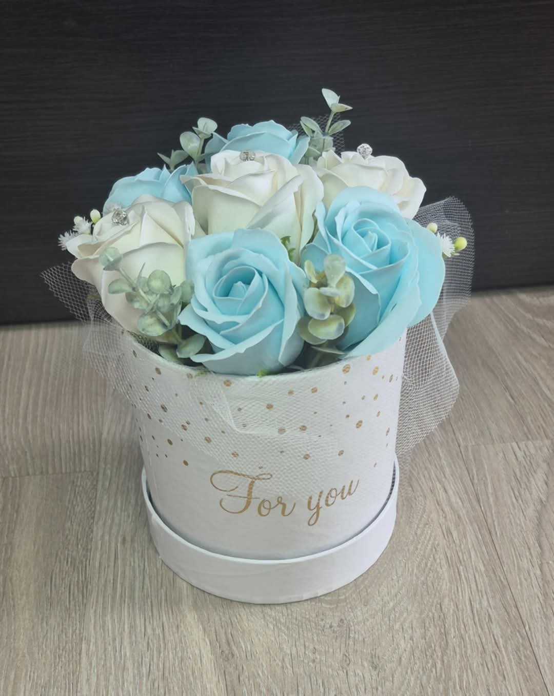 Bukiet w ozdobnym pudełku wykonany jest z wysokiej jakości kwiatów mydlanych oraz sztucznych dodatków.