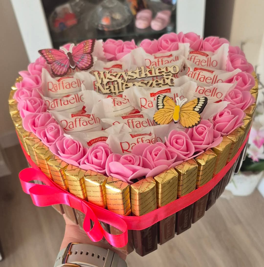 Serce z czekoladek merci, wypełnione pralinkami Raffaello, ozdobione różowymi różami piankowymi.